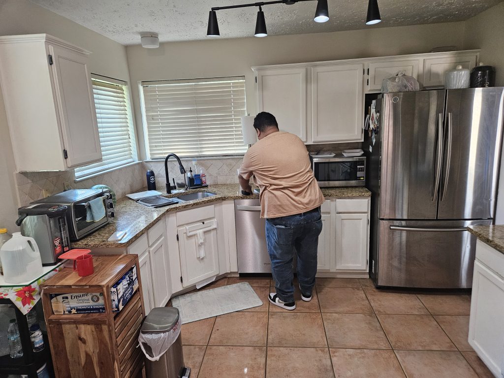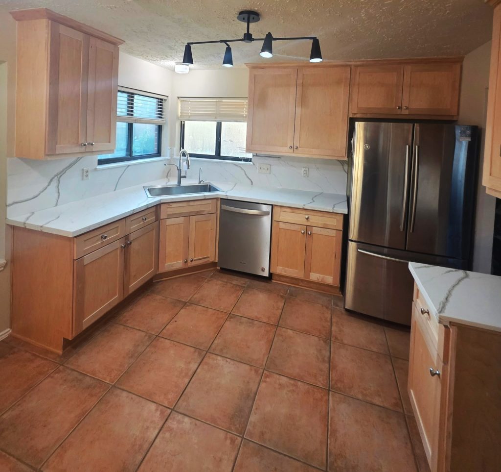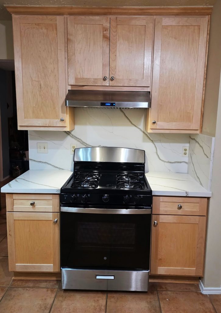 Updating this Sugar Land client's kitchen with custom-built cabinets, new backsplash and countertops became a seamless project once all the materials arrived. The cabinets are constructed of maple wood and finished with varnish to reveal the natural beauty of the wood. Quartz countertops and backsplash provided unity to the simple, yet functional design. Fresh paint, a new sink and stove polished the update bringing satisfaction to the clients.