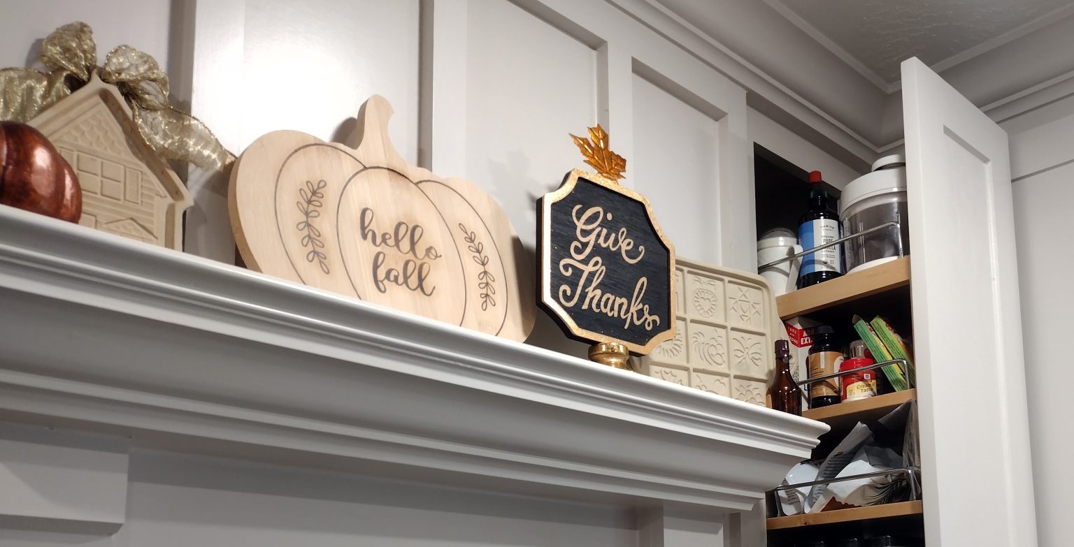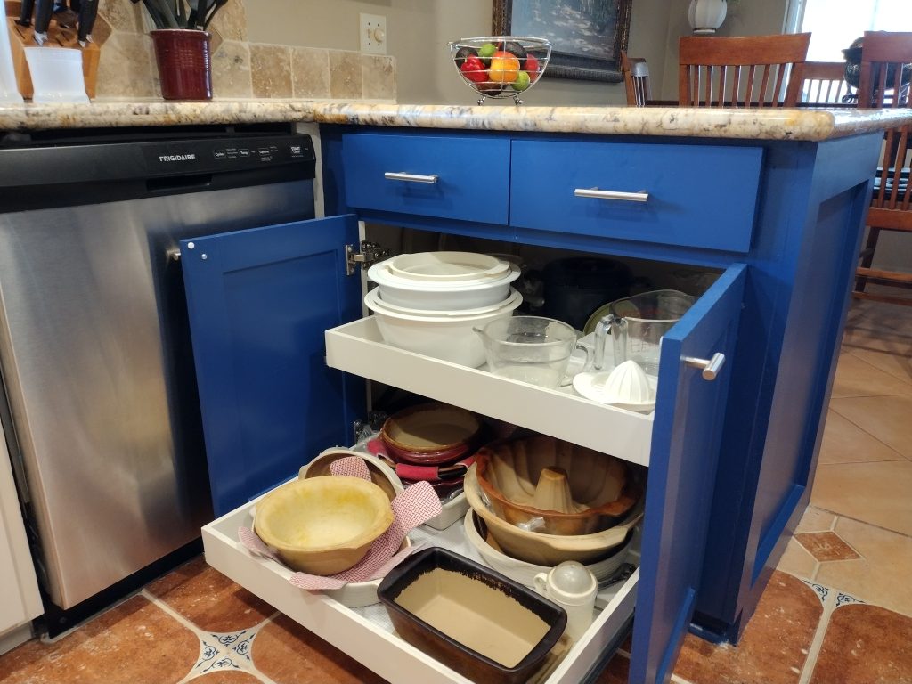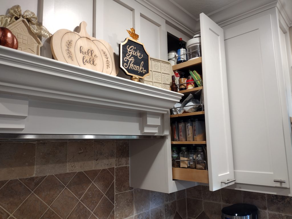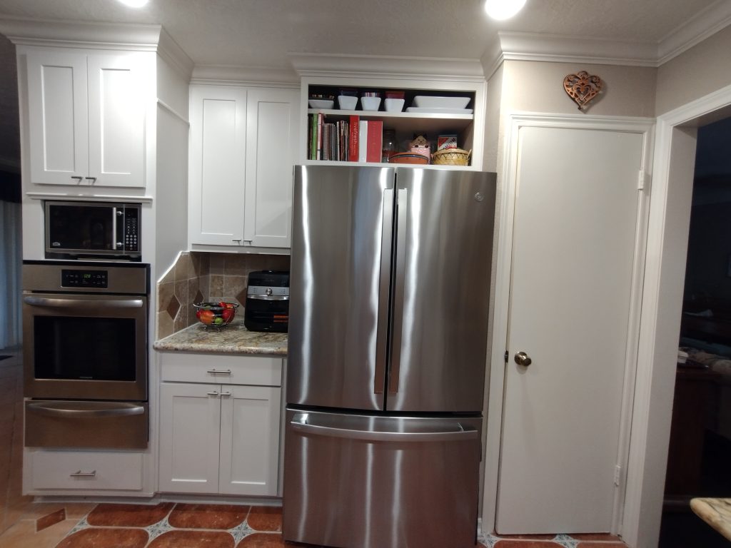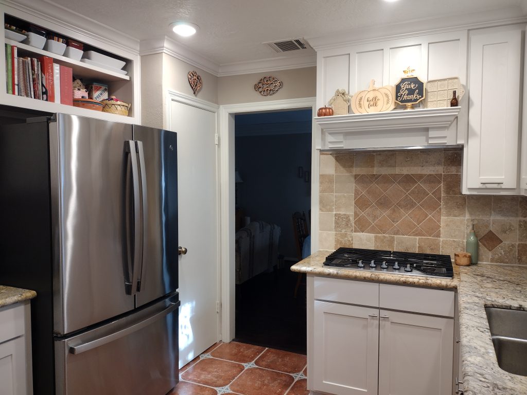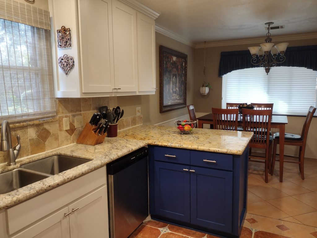 This Stafford kitchen remodel begins with raising the ceiling by demolishing the fur down. Once removed, the gas, electric and water lines had to be rerouted as explained in the video below. This allowed for taller custom-built upper cabinets and can lighting in the new higher ceiling. A new vent hood was covered by a custom-built cover with a mantel for added appeal. Next to the vent hood is a custom-built slide out spice rack. Base cabinet boxes have new door and drawer faces. They also were fitted with custom-built slide out shelves. A new cabinet above the wall oven was designed to store bakeware, cutting boards and trays divided by vertical slats. All cabinets and drawers have soft closing mechanisms. An open shelf above the refrigerator allows for storage of cookbooks and platters. The peninsula features a contrasting Indigo Blue color that matches the blue in the Spanish floor tile. Crown molding adds a finishing touch to the ceiling.